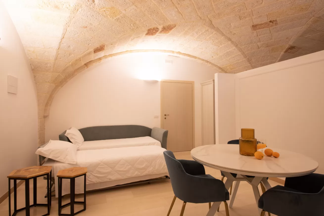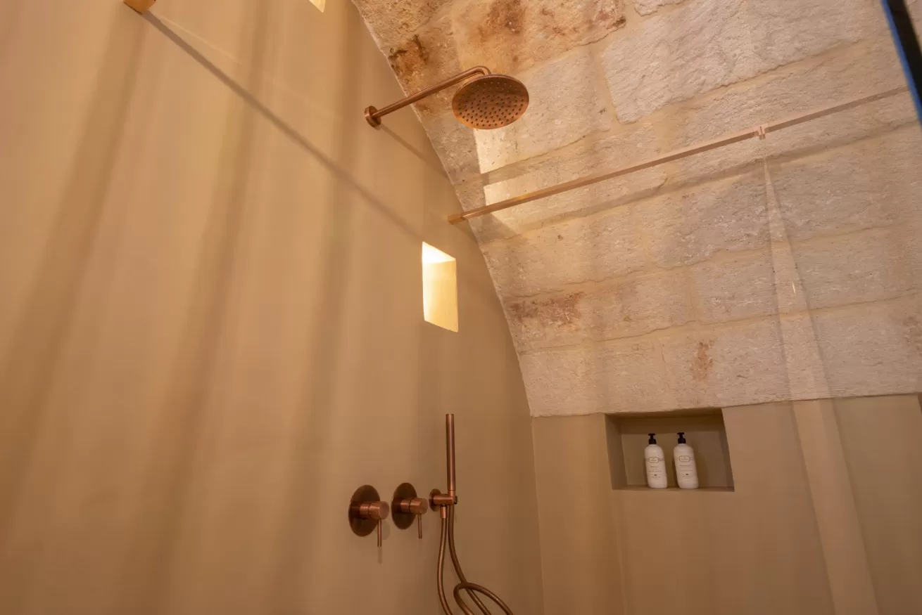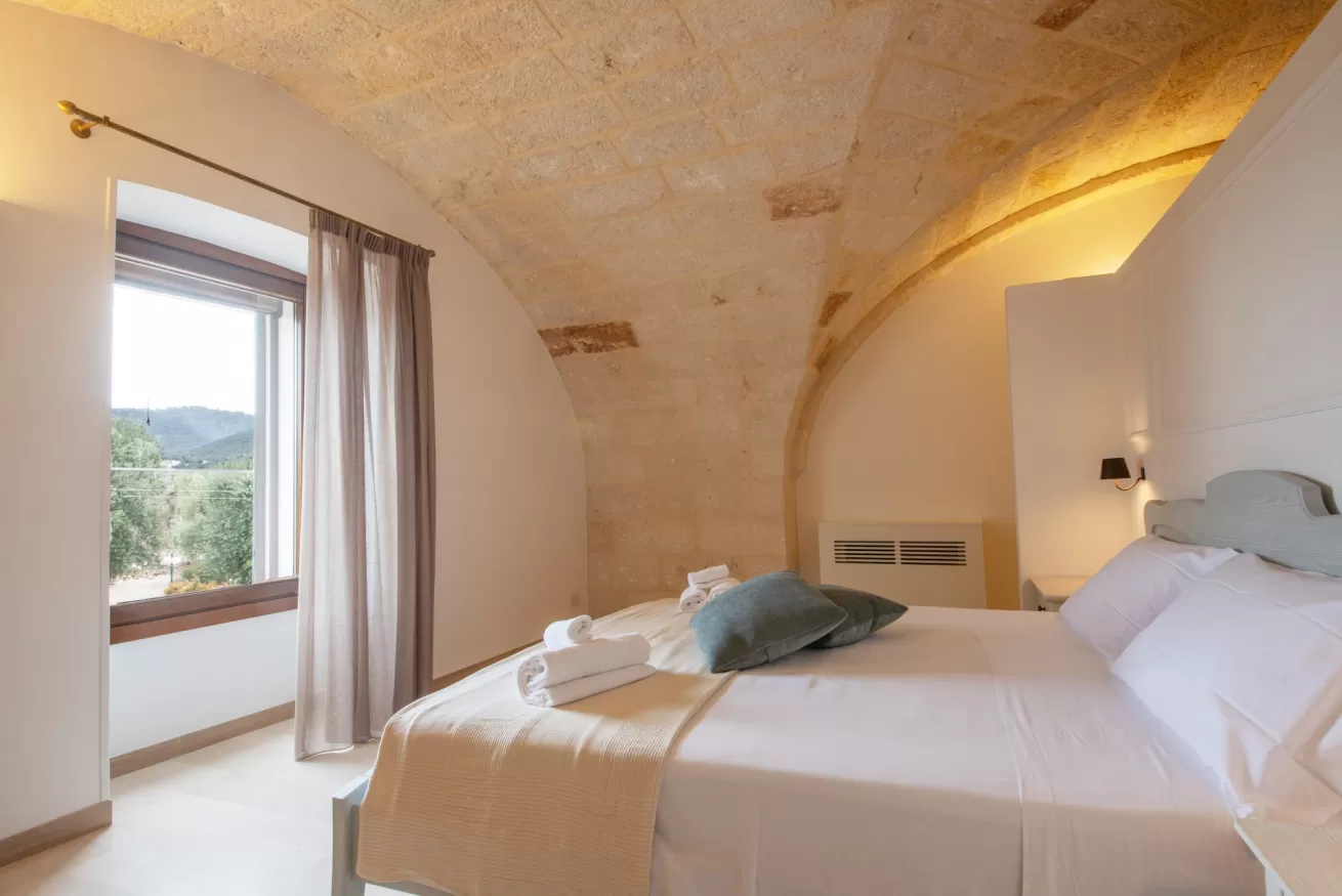 Sotto il suggestivo cielo di volte in pietra, la camera coniuga eleganza e calore, offrendo una vista incantevole sulle dolci colline pugliesi e trasformando il soggiorno in un’esperienza intima, rilassante e memorabile.