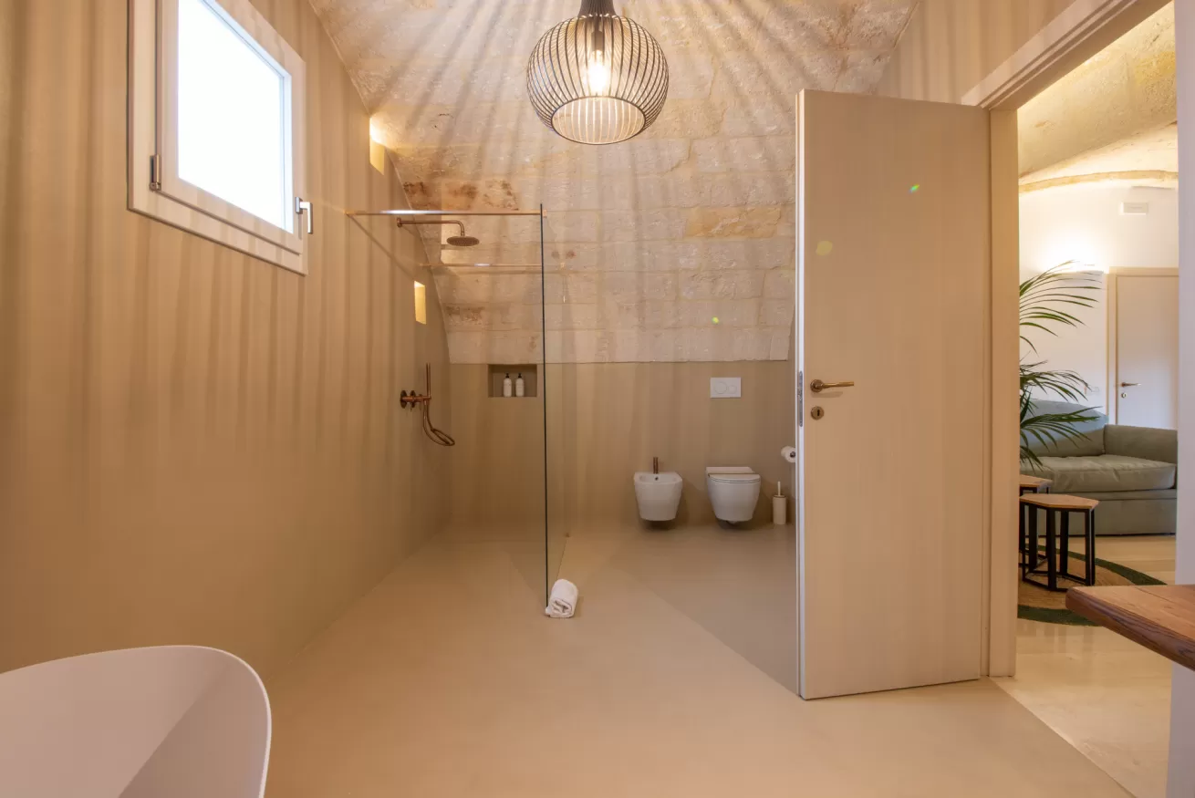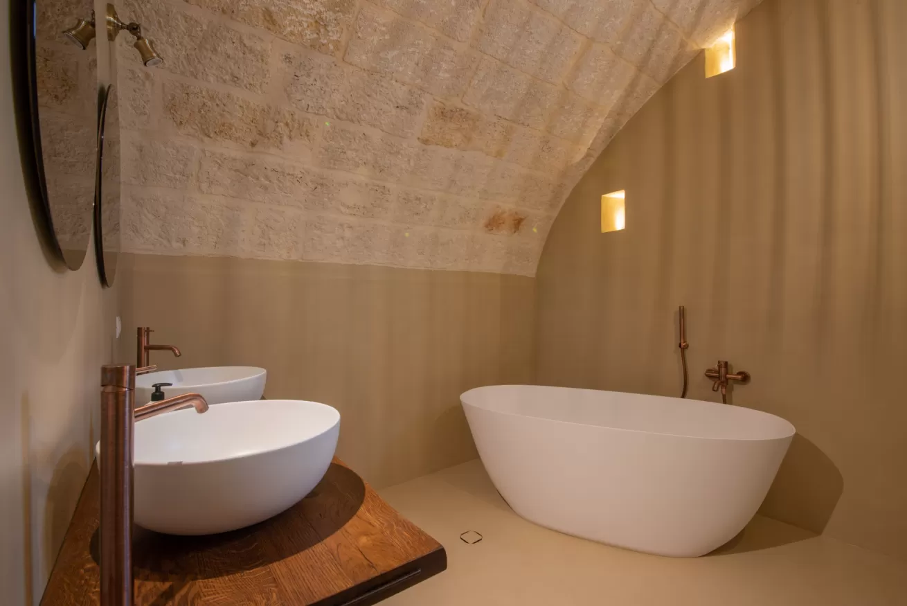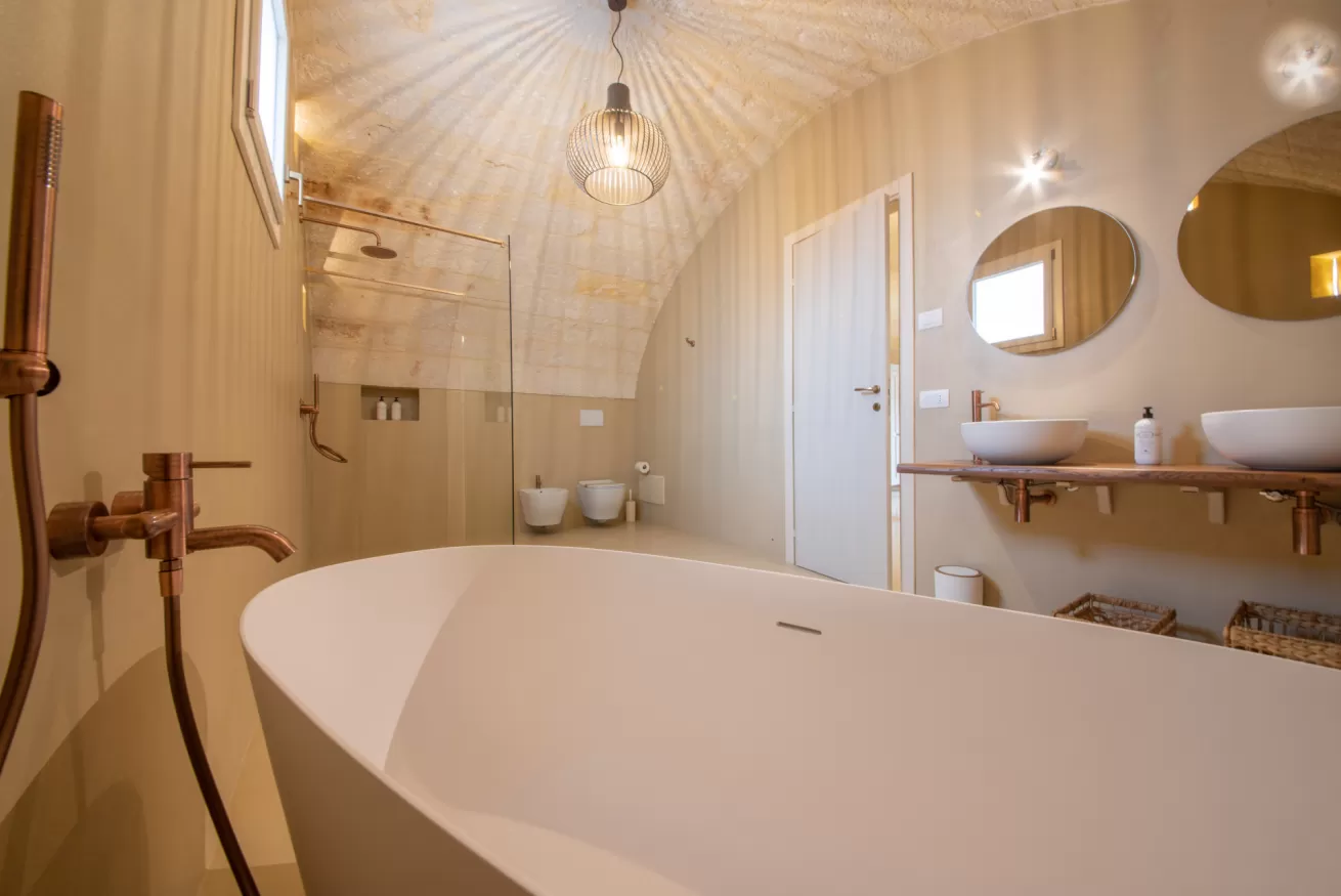 Sotto il suggestivo cielo di volte in pietra, la camera coniuga eleganza e calore, offrendo una vista incantevole sulle dolci colline pugliesi e trasformando il soggiorno in un’esperienza intima, rilassante e memorabile.