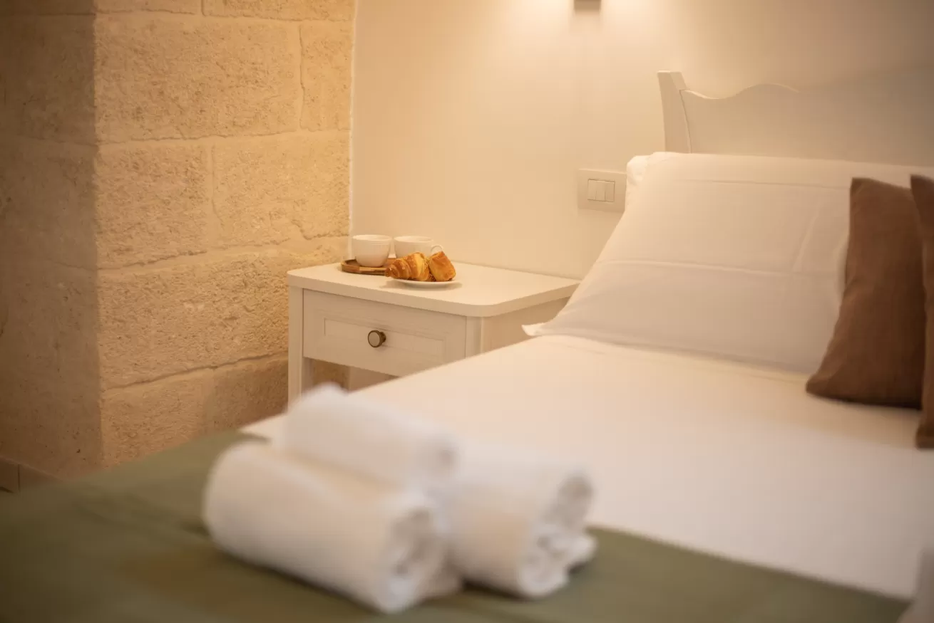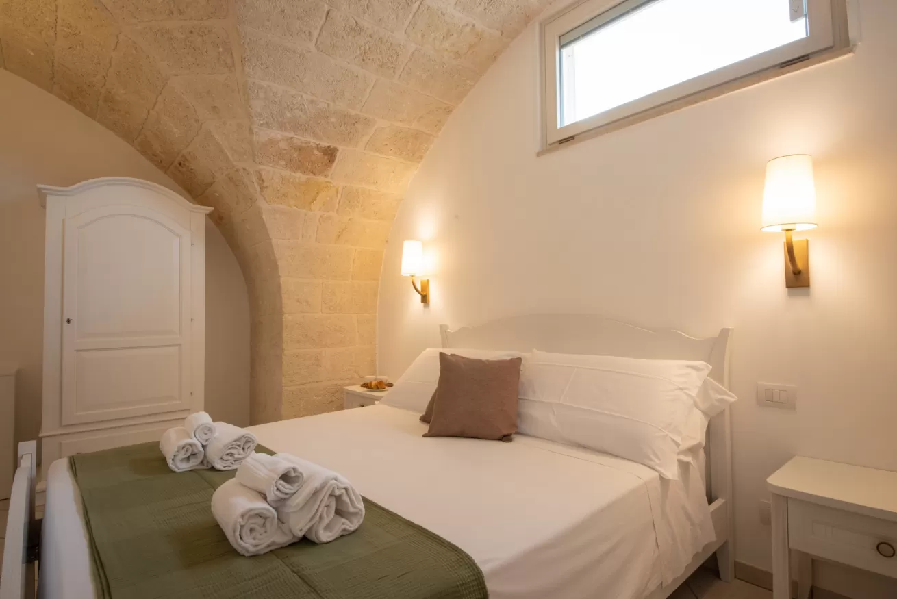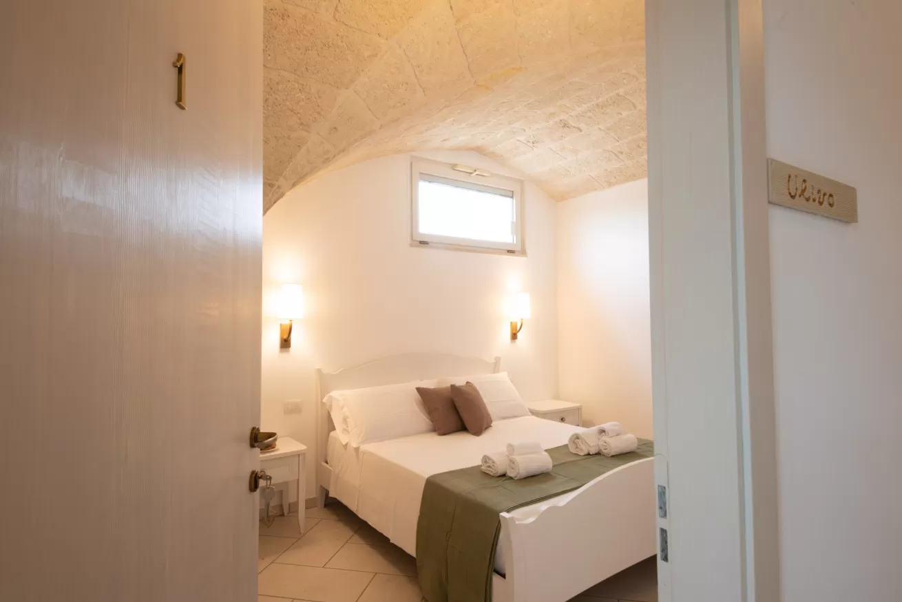 Gli ospiti possono usufruire del servizio di pulizia giornaliera e di una colazione completa, per iniziare la giornata con piacere. Sotto l’incantevole volta a stella, la camera avvolge gli ospiti con tonalità calde di beige e verde oliva, offrendo un’atmosfera intima e rilassante, perfetta per vivere l’autenticità e il charme di Masseria Galleppa.